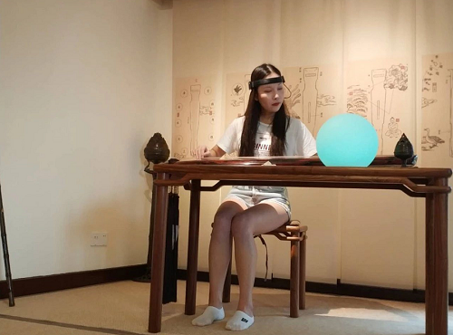 就在全体观众渐渐在古韵悠长中,挟仙游音韵时,陈亮教授示意琴者们头上佩戴脑波仪,并启动“大白脑波灯”的开关。