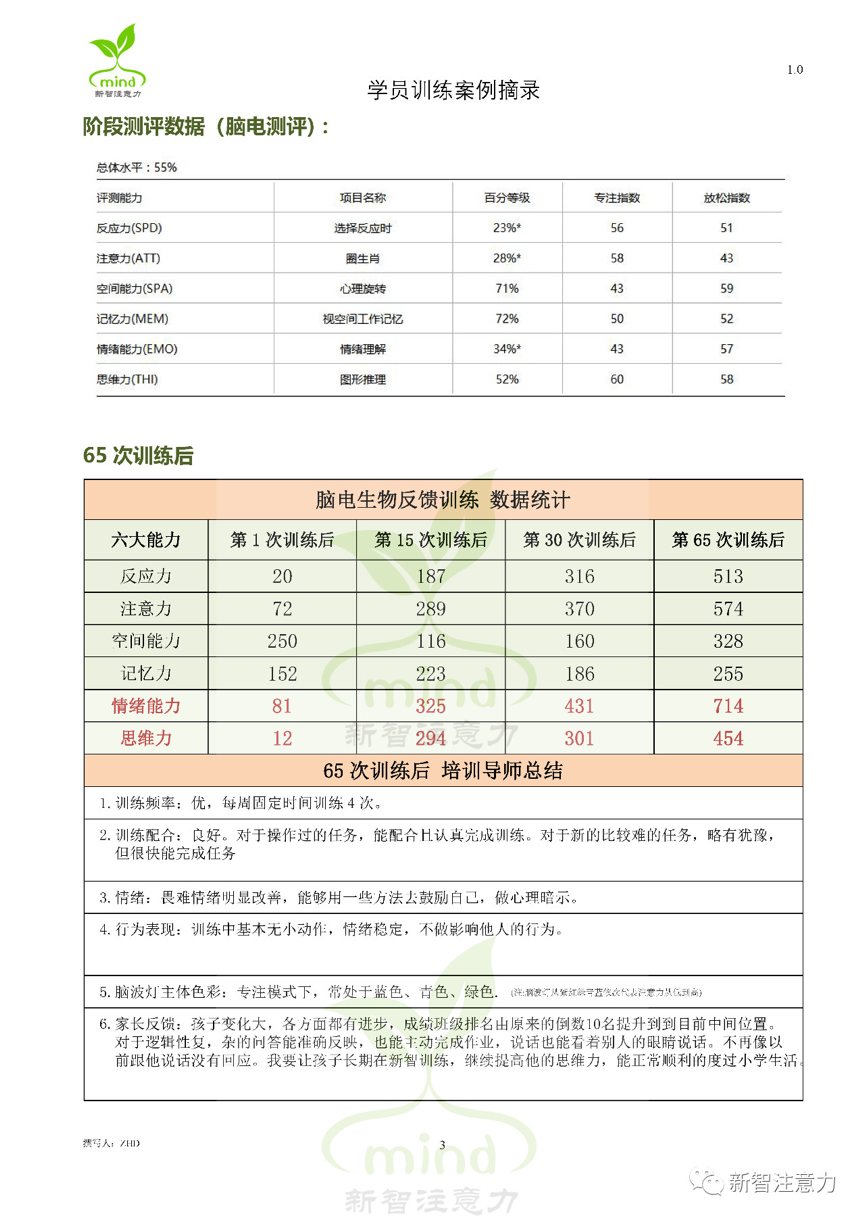 3. 经过65次训练之后,学员在入学之前存在的注意力分散问题、严重畏难问题、情绪对抗问题基本得到解决,从小学老师到家长,都认为孩子的变化令人欣喜。