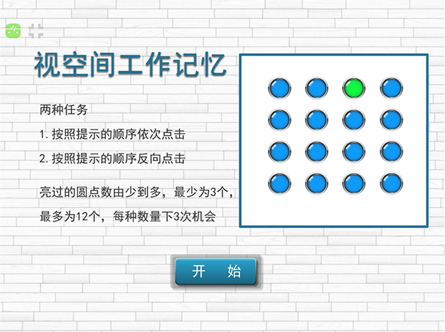 例如,我们可以通过心理学经典的“视空间”范式,来训练学生的注意和记忆功能。在视空间记忆广度的训练中,电脑屏幕上会一次出现几个小圆球,要求学生尽可能地记住这些圆球出现的次序和位置,圆球呈现结束后,请学生按照顺序和逆序,将圆球依次复现。