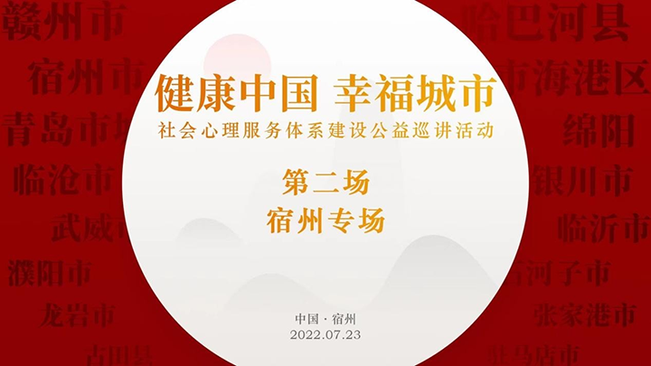 7月23日,“健康中国、幸福城市”全国社会心理服务体系建设公益巡讲活动第二站宿州专场圆满结束,下一站将在青岛市城阳区举行。